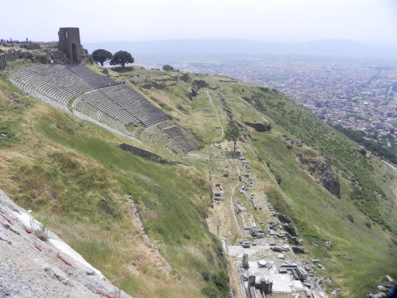 Als eerst stond de klim naar de Akropolis. Gelukkig met de kabelbaan! Van daar uit hadden we een mooi uitzicht op een enorme dam en een deel van de stad. Eenmaal boven gekomen, kregen we schitterende Romeinse opgravingen te zien. Uiteraard de Akropolis, verschillende beelden en een enorm theater die op de stad Bergama uitkijkt. Er zijn ook opgravingen te zien van de tempel van Dionysus. Daarnaast is er de tempel van Athene. Tevens is de altaar van Zeus te bewonderen.