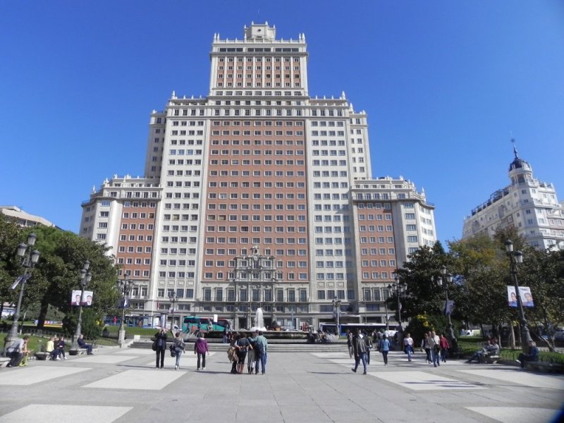 We vervolgde onze weg naar ‘Plaza de Espana’. Dit plein is gelegen aan de westkant van Grand Via. Dit plein wordt versierd door diverse beelden van schrijver Miguel de Cervantes. Don Quichot is wellicht één van de bekendste. Dit plein kenmerkt zich verder door hoge gebouwen, zoals Edificio Espana. Dit gebouw in Neobarok stijl huisvest luxe appartementen. Voorheen heeft dit gebouw gediend als hotel en kantoorruimte.