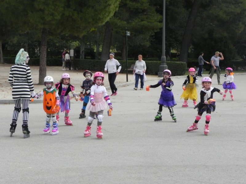 Vanaf de vijver met het standbeeld van de engel Caido heb je een mooi uitzicht op de stad. De Madrilenen zijn gek op skeeleren en hardlopen. Het was ons ook duidelijk dat het Halloween was.