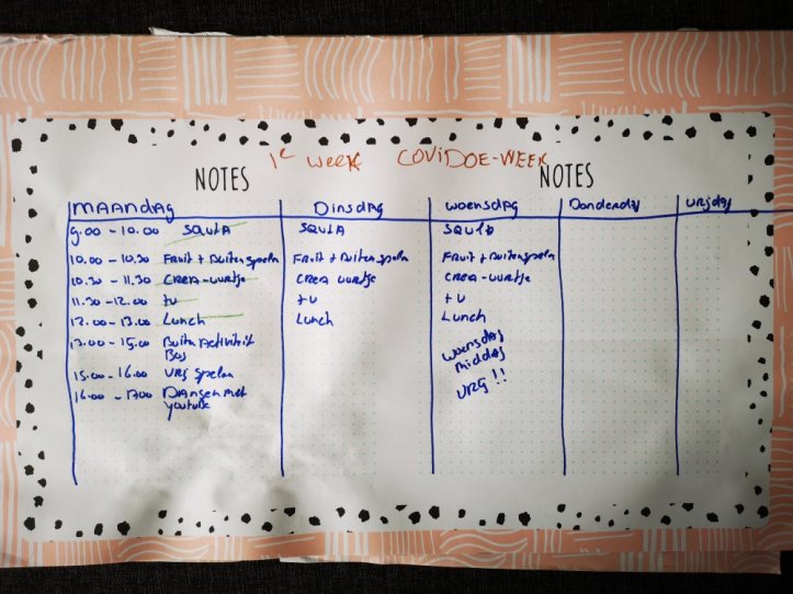 Op het moment dat het bekend werd dat de scholen gesloten blijven, hebben we een weekplan opgesteld. We bekijken dit plan per dag. Het is belangrijk dat er een vorm van vastigheid in zit. Zo behouden we toch een ritme. We noemen het een COVID(OE) week plan.