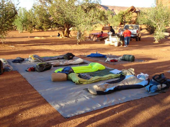 We kregen Navajo taco als avond eten en dat was zeker heel goed te eten. Al hoewel het kamp zeer eenvoudig was, op de chemische wc’s (dixies) na, was het goed geregeld. De gastenheren en vrouwen waren erg vriendelijk en grappig. Ze stonden open voor vragen over de manier waarop indianen leefden. We konden hen vragen stellen over de geschiedenis en het hedendaagse leven. Dat was zeker interessant. De Navajo indianen zijn mede verantwoordelijk voor de Amerikaanse overwinning in de Pacific tijdens de Tweede Wereld oorlog. Ze gebruikten de Navajo taal als codetaal. Dit is verfilmd in de film “Windtalkers”.