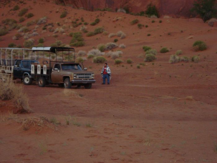 Als je als toerist bij de Navajo terecht komt, kan je verwachten dat je eerst langs een toeristenmarkt gaat. Daarnaast krijg je een inkijkje in de traditie van de Navajo. Ondertussen probeerde de chauffeur ons ook te vermaken tijdens het rijden. Met uitspraken zoals “We go up and down and up and down” als we over zandpaden heen reden. Soms gooide hij er een “Yahoooooooo dot commmm” uit. Ieder gevleugelde uitspraak werd afgesloten met “Just kidding”. We stopten bij een aantal hutjes, ook wel hogan genaamd, waarin een oude vrouw zat met haar kleinzoon. Daarin lieten ze zien hoe ze konden weven en breien. We stopten bij verschillende rotsformaties waarmee je met genoeg fantasie ook daadwerkelijk verschillende vormen zag die voornamelijk op dieren lijken. Zoals een slapende draak, beer en de beroemde Falkor uit de film “The Never ending Story”. Na een paar uur rondrijden en stops in dit toch wel bijzondere Monument Valley stopte we uiteindelijk bij ons kamp.