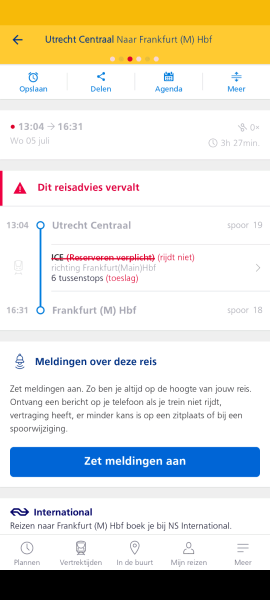 De treinreis naar Frankfurt zie ik als een korte trip. Vooraf boeken is wel aan te raden en soms zelfs verplicht. Voor zakelijk reizen is reserveren natuurlijk een aanrader. Let op dat bij calamiteiten zoals een lokale storm, de reis alsnog gemaakt kan worden. Laat je informeren door de diverse apps van de NS, het weer en het nieuws.