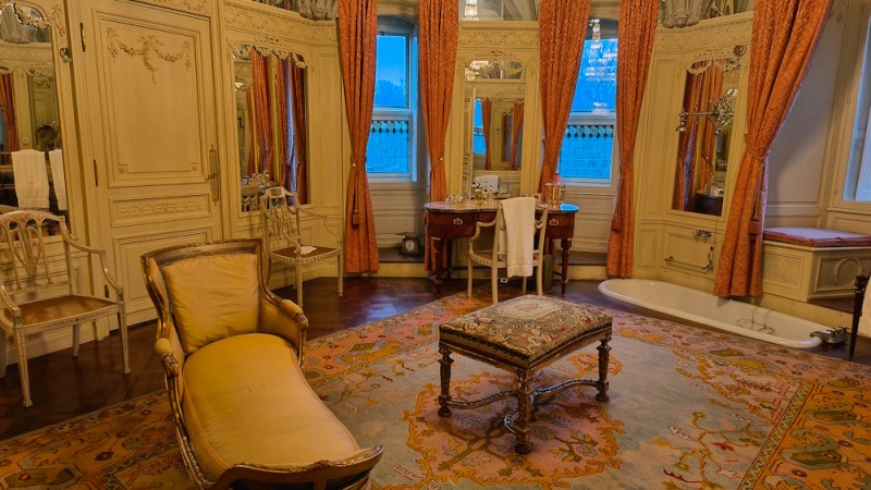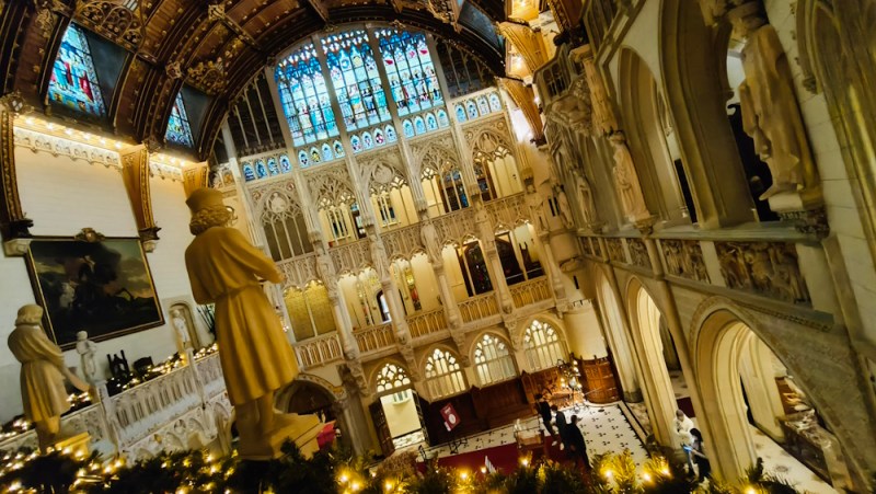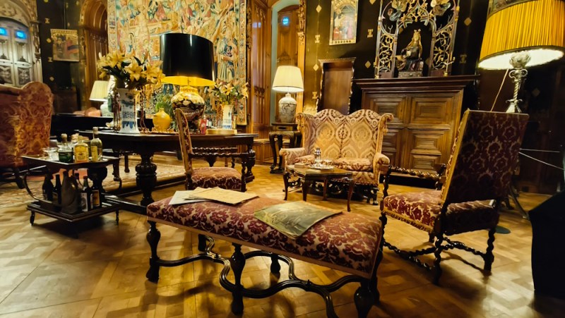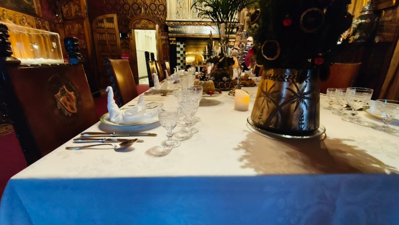 Binnen in het kasteel zijn diverse slaapkamers, badkamers en de keuken te wonderen. Maar de centrale hal in het kasteel is adembenemend.